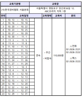 (사)한국경비협회서울분회(분회장 김태현)는 오는 10월 13일부터 12월 31일까지 서울 영등포구 교육장에서 ‘2025년 4분기 일반경비원 신임교육’을 실시한다. 이번 교육은 비합숙·주간 과정으로 진행되며, 교육비는 110,000원이다. 서울분회는 체계적 법정 교육을 통해 책임감 있고 전문적인 경비 인력을 양성하고 있으며, 교육 수료 후 다수의 회원사로 취업 연계가 가능한 점이 큰 장점이다. 0 0 KSN 한국경비뉴스 씨큐리티코리아 박선경기자 ksanpr@ksan.or.kr 씨큐리티코리아 박선경기자의 기사 더보기 저작권자 ⓒ KSN 한국경비뉴스, 무단 전재 및 재배포 금지