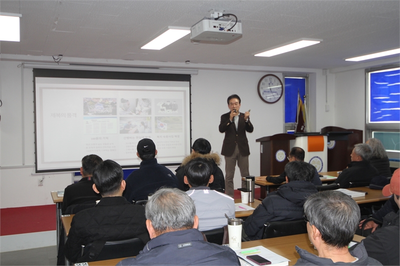 (사)한국경비협회 충북·세종지방협회에서 윤희근 전 경찰청장이 특강을 진행하고 있는 모습.
