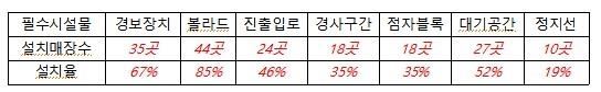 시설물별 설치현황은 경보장치 35개소(67%), 볼라드 44개소(85%), 진출입로 24개소(46%), 경사구간 18개소(35%), 점자블록 18개소(35%), 대기공간 27개소(52%), 정지선 10개소(19%)로 나타났다.