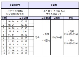(사)한국경비협회 대구경북지방협회(회장 양봉조)는 2025년 10월 14일부터 12월 26일까지 대구 중구 동덕로 173, 엠에스빌딩 7층에서 2025년 4분기 일반경비원 신임교육’을 실시한다. 이번 교육은 비합숙·주간 과정으로 진행되며, 교육비는 100,000원이다. 대구경북지방협회는 지역 내 다수의 협회 회원사와 연계하여 수료생의 현장 취업률을 높이는 실무 중심의 교육체계를 구축하고 있다. 3 0 KSN 한국경비뉴스 씨큐리티코리아 박선경기자 ksanpr@ksan.or.kr 씨큐리티코리아 박선경기자의 기사 더보기 저작권자 ⓒ KSN 한국경비뉴스, 무단 전재 및 재배포 금지