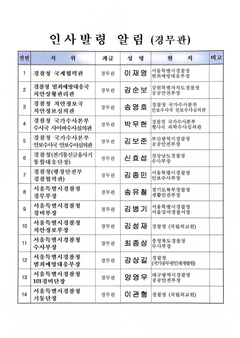 업계 동향 경찰청, 경무관 51명 전보 인사 단행… 강순보 범죄예방대응국 치안상황관리관 임명 – 서울청 수사·안보라인 대폭 교체, 현장 중심 예방치안 강화 – 씨큐리티코리아 박선경기자 승인 2025.10.31 08:17 0 경찰청은 10월 24일 밤, 전국 주요 보직을 맡은 경무관 51명에 대한 전보 인사를 단행했다. 인사발령명단은 다음과 같다. 4 0 KSN 한국경비뉴스 씨큐리티코리아 박선경기자 ksanpr@ksan.or.kr 씨큐리티코리아 박선경기자의 기사 더보기 저작권자 ⓒ KSN 한국경비뉴스, 무단 전재 및 재배포 금지