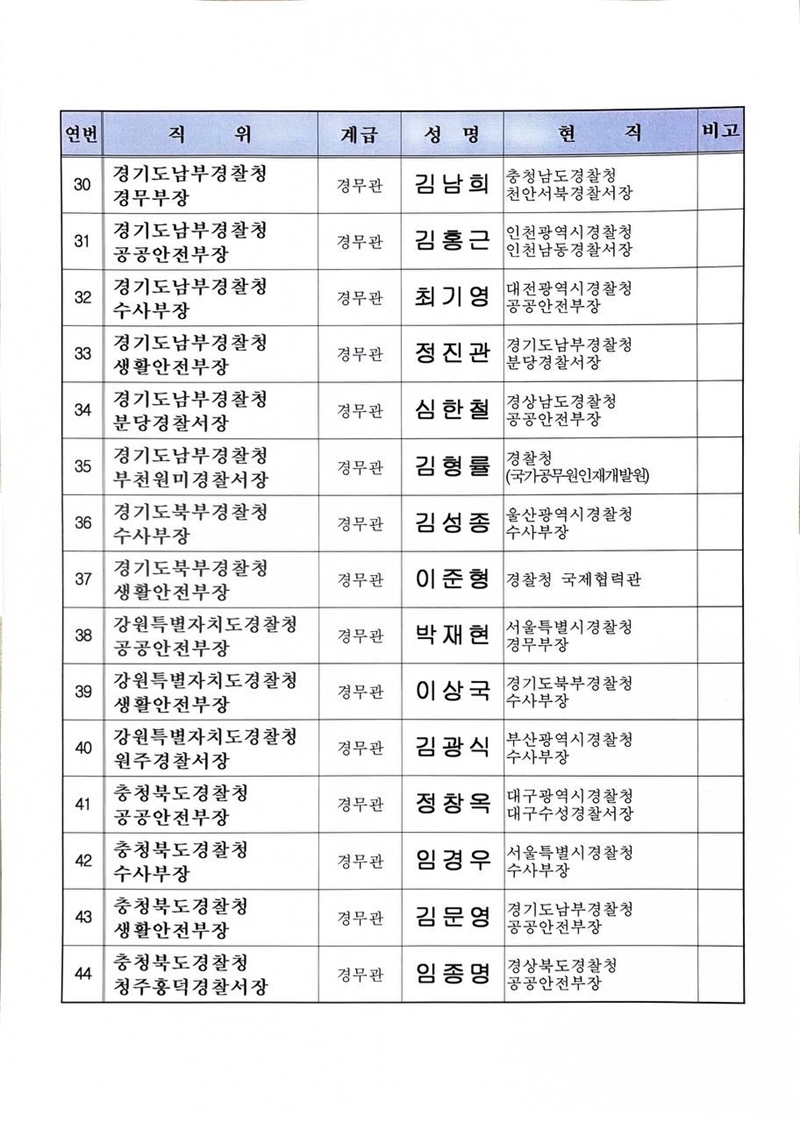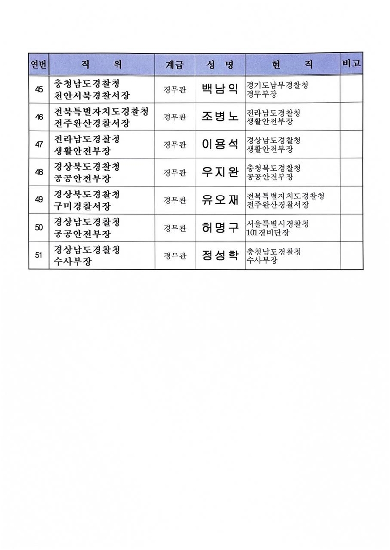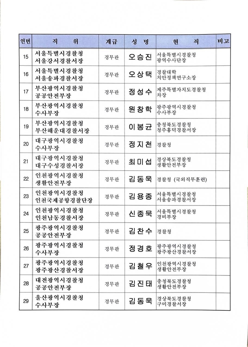경찰청은 10월 24일 밤, 전국 주요 보직을 맡은 경무관 51명에 대한 전보 인사를 단행했다. 인사발령명단은 다음과 같다. 4 0 KSN 한국경비뉴스 씨큐리티코리아 박선경기자 ksanpr@ksan.or.kr 씨큐리티코리아 박선경기자의 기사 더보기 저작권자 ⓒ KSN 한국경비뉴스, 무단 전재 및 재배포 금지